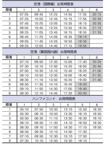 | 都心空港(貿易センター) | 仁川空港 | 05:20 | 20:00 | 05:30 | 22:30 | 5分~15分 | 65分 |