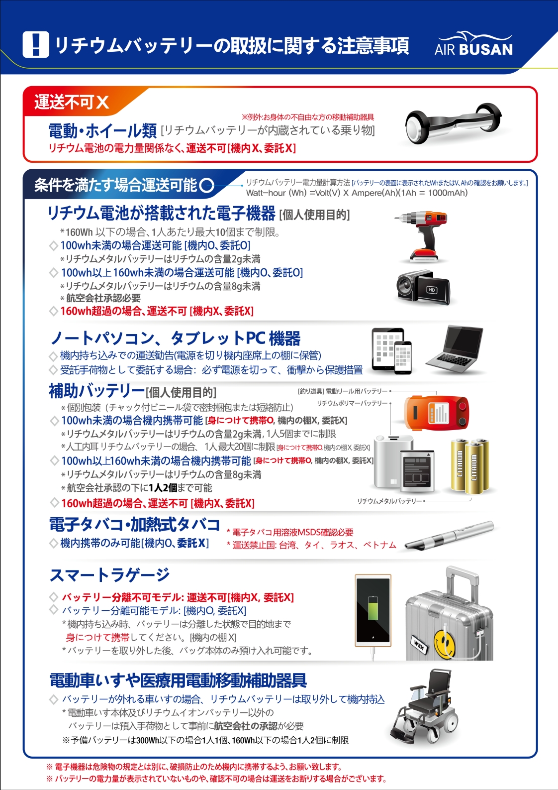 | 航空会社の承認 | ステッカー付き | 短絡防止 | 保管場所 | ||